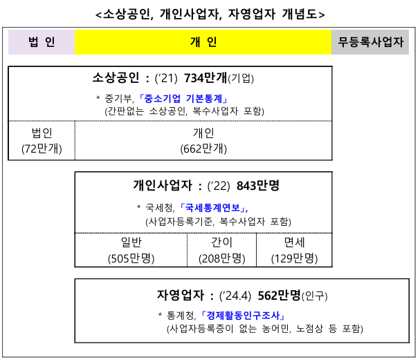 ㅇ (개인사업자) 사업장 유무 및 상시근로자 수와 관계없이국세청에 개인사업자로 등록한 사람·업체(부가가치세법)